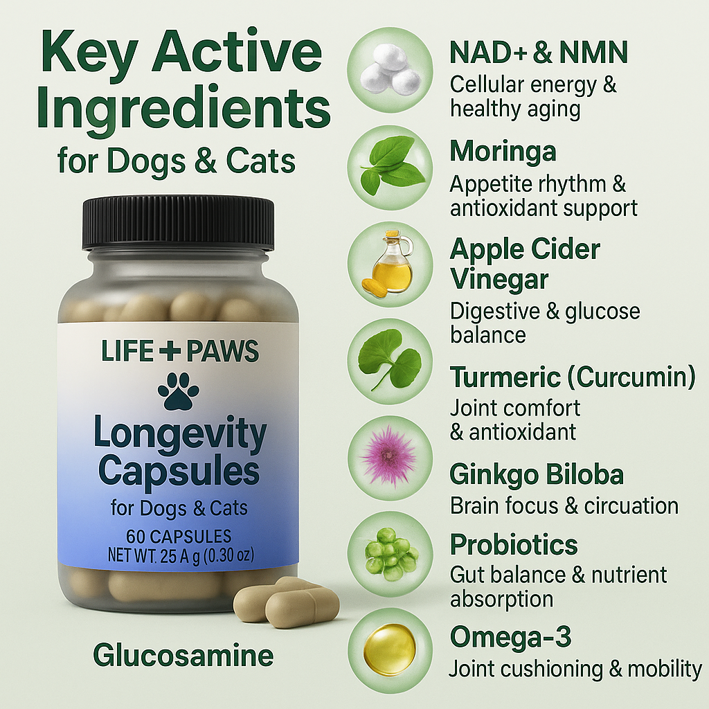 âAs a veterinarian focused on healthy aging, I look for gentle, multi-pathway support rather than quick fixes. LIFE+ PAWS® Longevity Capsules combine NADâº/NMN for cellular energy with omega-3, turmeric, ginkgo, probiotics, collagen and glucosamine. Together they help steady appetite and energy rhythms, support cognition, keep joints comfortable, and maintain digestive balanceâthe foundations of a longer, happier life for dogs and cats.